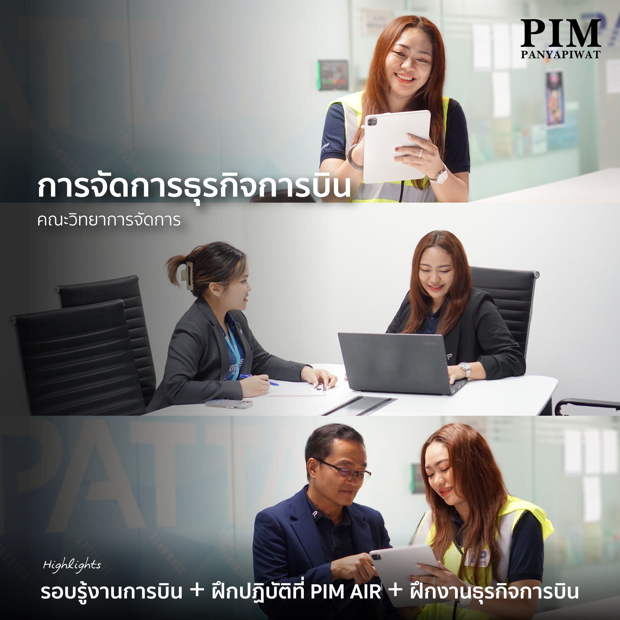 สาขาวิชาการจัดการธุรกิจการบิน นักศึกษาจะได้เรียนจริงและฝึกปฎิบัติจริงที่ Aviation Business Training Center หรือ PIM AIR ตั้งแต่ชั้นปีที่ 1-4 ก่อนไปฝึกงานในกลุ่มธุรกิจการบินทั้งสายการบินและท่าอากาศยานทั้งในไทยและต่างประเทศ เพื่อเก็บเกี่ยวประสบการณ์และเรียนรู้ทักษะเพิ่มเติมที่ตอบโจทย์การทำงานและอาชีพด้านการบินที่มีมากมาย