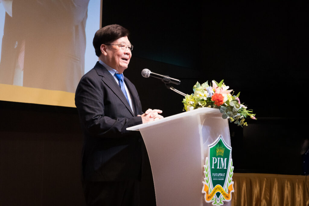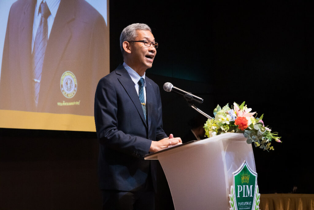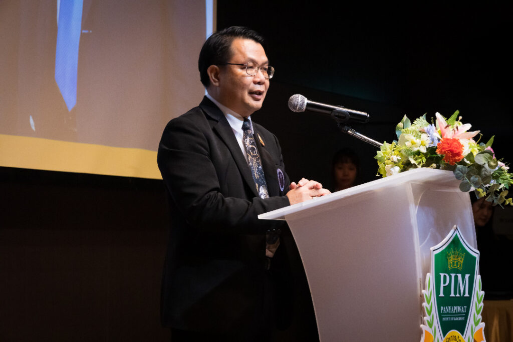 รองศาสตราจารย์ ดร.สมภพ มานะรังสรรค์ กล่าวว่า “หัวข้อในวันนี้น่าสนใจมากเพราะปัจจุบันมีการ Disruption เกิดขึ้นมากมาย เพื่อไม่ให้บัณฑิตหรือลูกศิษย์ของเราถูก Disrupted เราต้องร่วมกันคิดและกำหนดทิศทางให้เข้มแข็งขึ้น หากเราต้องการสร้างบัณฑิตในอุดมคติอย่างมีประสิทธิภาพนั้น ต้องเข้าใจอย่างน้อย 2 เรื่อง ได้แก่ IT Literacy ความสามารถในการเข้าใจเทคโนโลยี โดยเฉพาะในยุคของ Generative AI ซึ่งมีความสำคัญมาก และ Financial Literacy ความเข้าใจโลกของภาคการเงินที่เปลี่ยนแปลงอย่างรวดเร็ว ดังนั้นสถาบันการศึกษาในหลายประเทศรวมถึง PM เองจึงพยายามเสนอแนวทางที่เรียกว่า Work-based Education การศึกษาเชื่อมโยงกับโลกแห่งการทำงานอย่างแท้จริง ซึ่งวันนี้ในนามตัวแทน PIM ขอขอบคุณ วิทยากร ผู้ทรงคุณวุฒิ ผู้บริหารสถาบันอุดมศึกษาเครือข่ายภาคกลาง นักศึกษา รวมถึงท่านผู้มีเกียรติทุกท่านที่มาร่วมงานในวันนี้ เพื่อหาคำตอบที่เป็นจุดเริ่มต้นของกระบวนการปรับเปลี่ยนการศึกษาที่ตอบโจทย์โลกแห่งความเป็นจริง”