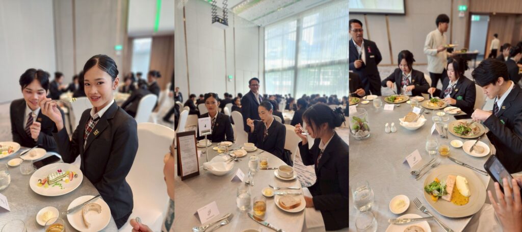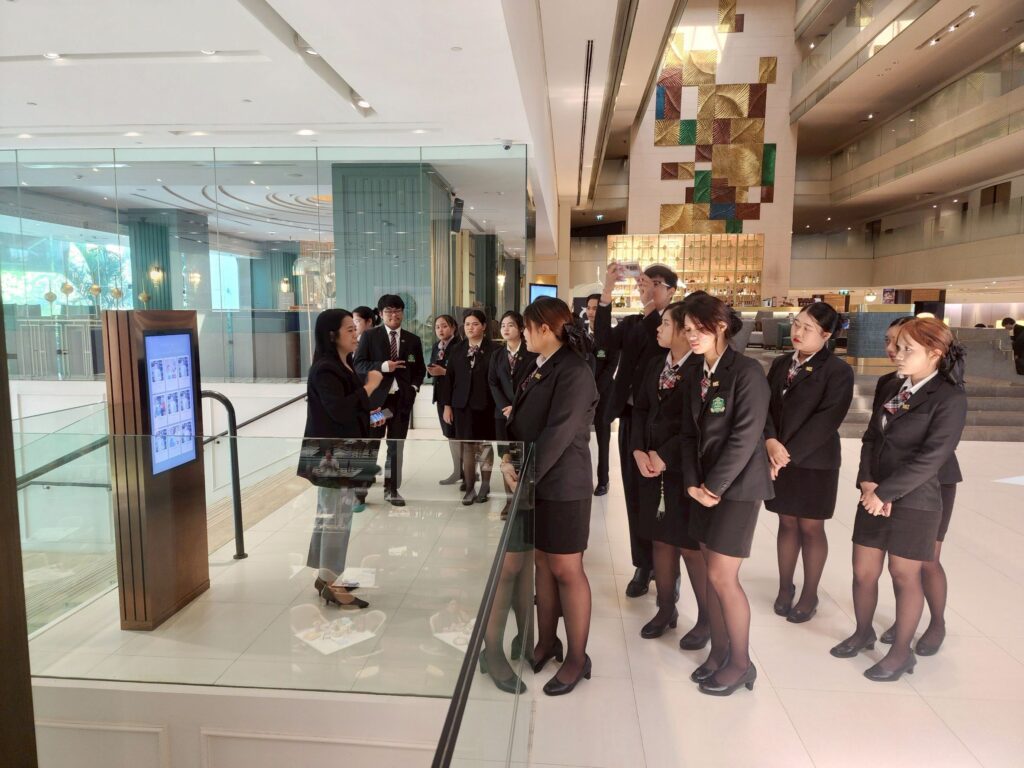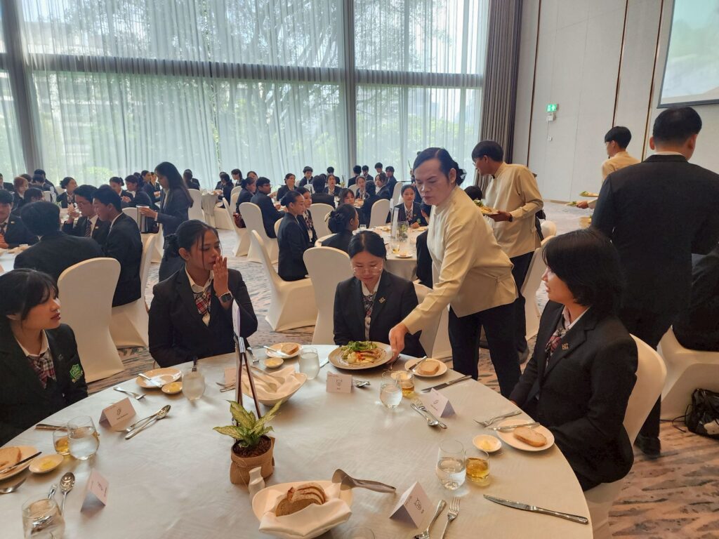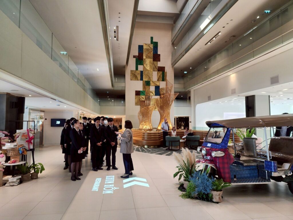 จากนั้นเดินชมสถานที่สำคัญของโรงแรมอย่างใกล้ชิดทั้งล็อบบี้, ห้องพักลูกค้า, ห้องอาหาร, ฟิตเนสเซ็นเตอร์, สระว่ายน้ำ และห้องประชุมสัมมนา ทำให้เกิดความเข้าใจในภาพรวมของงานบริการที่ชัดเจนและเป็นรูปธรรมมากยิ่งขึ้น ถัดมาเป็นการเรียนรู้มารยาทบนโต๊ะอาหารแบบสากล โดยผู้จัดการแผนกอาหารและเครื่องดื่มของโรงแรม ซึ่งเป็นทักษะสำคัญที่บุคลากรในอุตสาหกรรมการบริการและการท่องเที่ยวจำเป็นต้องมี