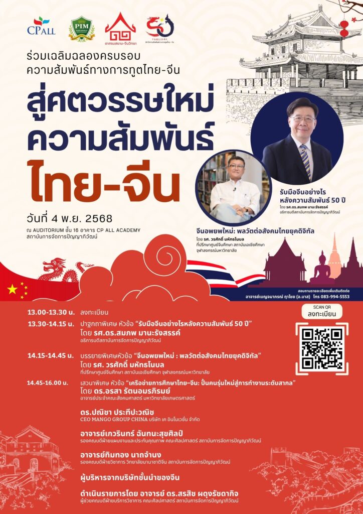 สถาบันการจัดการปัญญาภิวัฒน์ (พีไอเอ็ม) ขอเชิญร่วมเฉลิมฉลอง 50 ปี ความสัมพันธ์ทางการทูตไทย-จีน ในงานเสวนาวิชาการ “สู่ศตวรรษใหม่ ความสัมพันธ์ไทย–จีน” ตุลาคม 24, 2025 อภิสรา ใสคำ NEWS 50 ปี ไทยจีน, วรศักดิ์ มหัทธโนบล, สู่ศตวรรษใหม่ ความสัมพันธ์ไทย–จีน, ไทย-จีนสถาบันการจัดการปัญญาภิวัฒน์ (พ…Read More