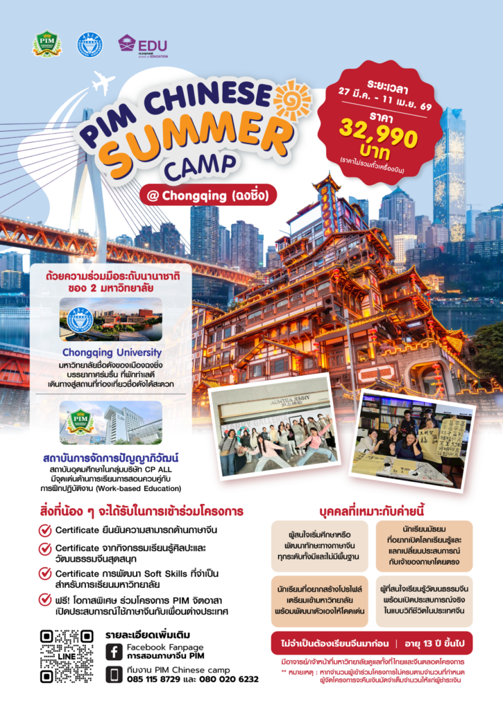 ขอเชิญชวนบุตรหลานในเครือซีพี ร่วมโครงการ PIM CHINESE SUMMER CAMP 2026 @ Chongqing (ฉงชิ่ง) ธันวาคม 18, 2025 อภิสรา ใสคำ NEWS Chongqing University, PIM CHINESE SUMMER CAMP 2026 @ Chongqing, จีนสถาบันการจัดการปัญญาภิวัฒน์ (P…Read More